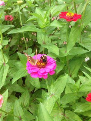 Paul Steen took this great picture of a bee and a butterfly sharing a zinnia flower in July. Come visit the garden and share the zinnias with the bees and butterflies, and take some zinnias home for your family.
