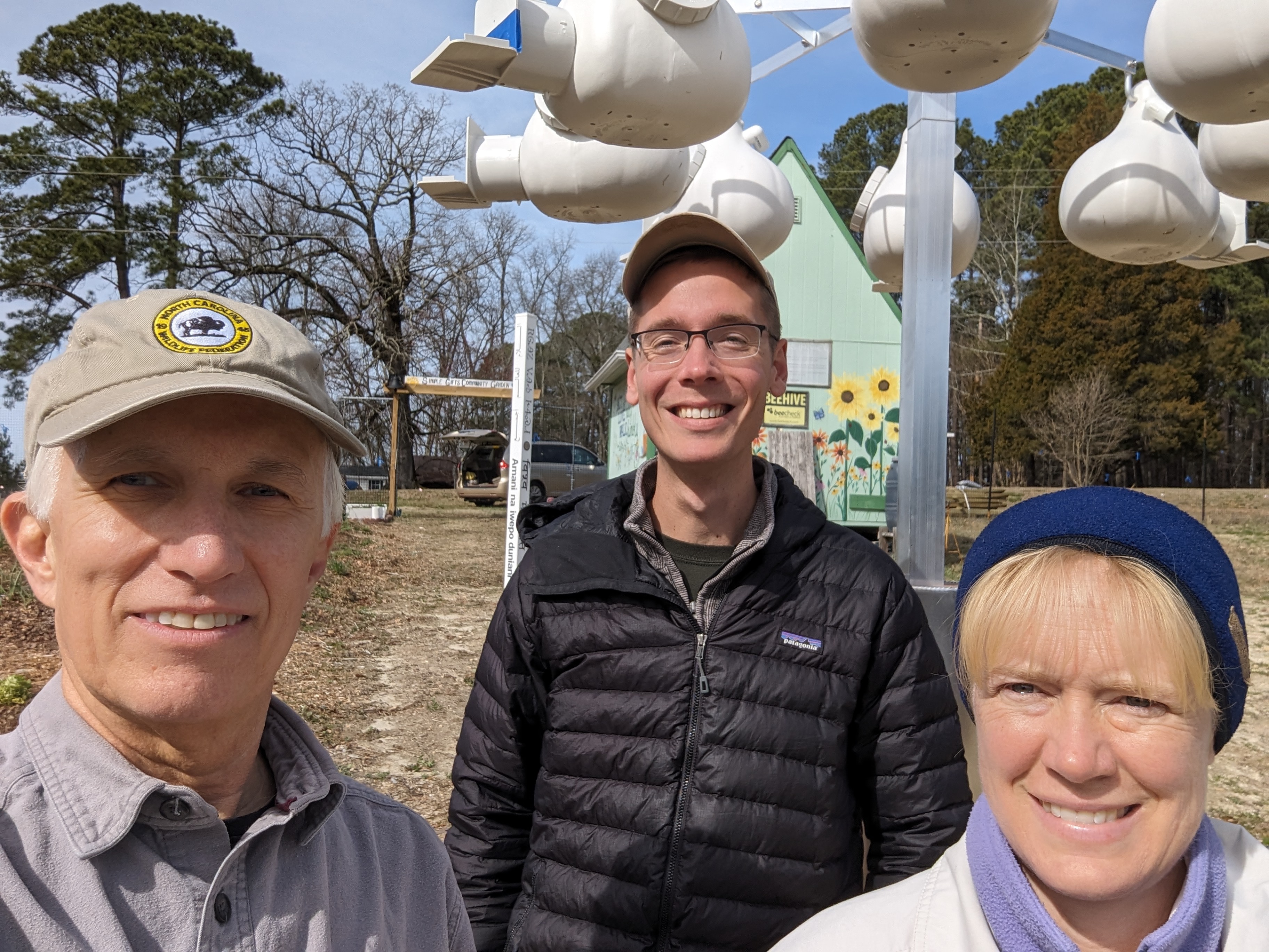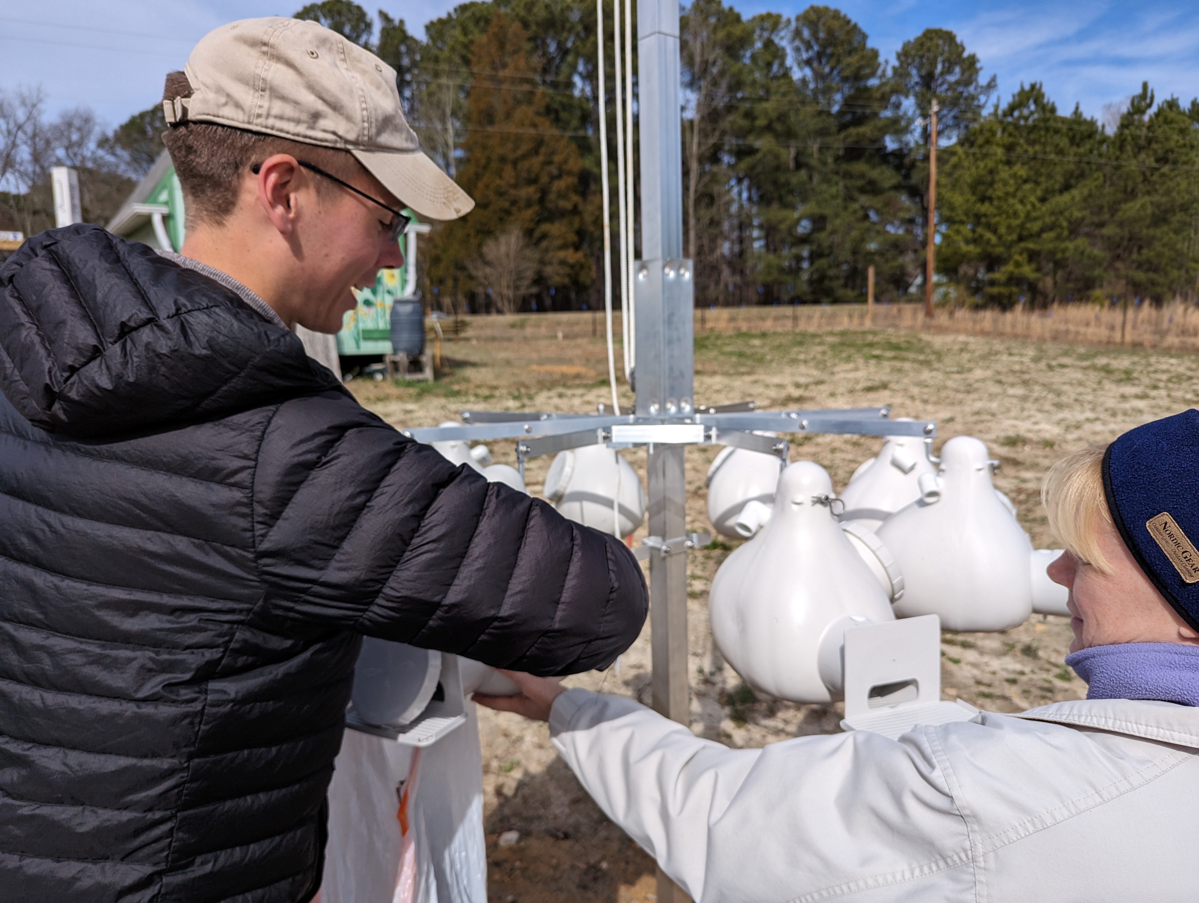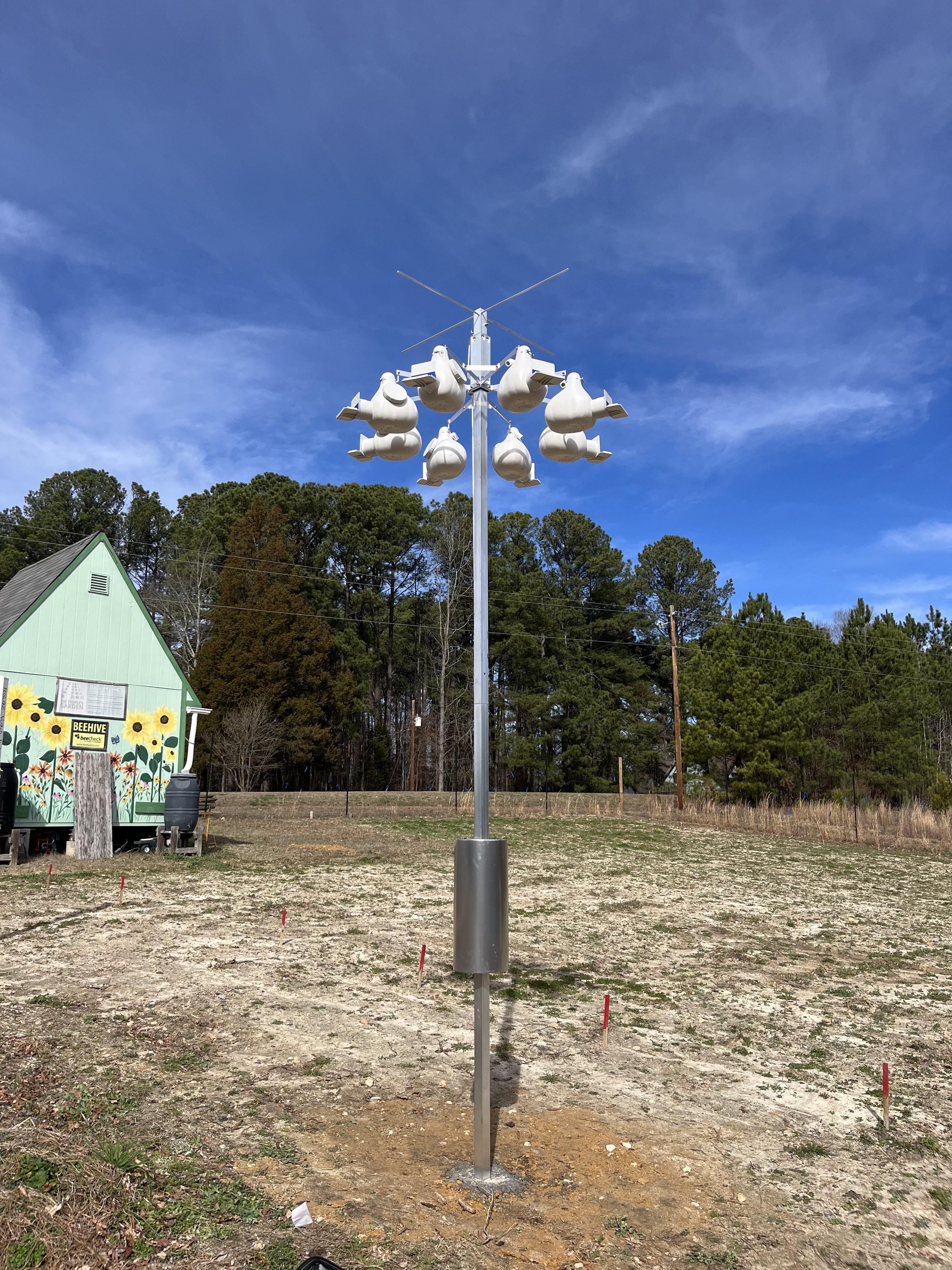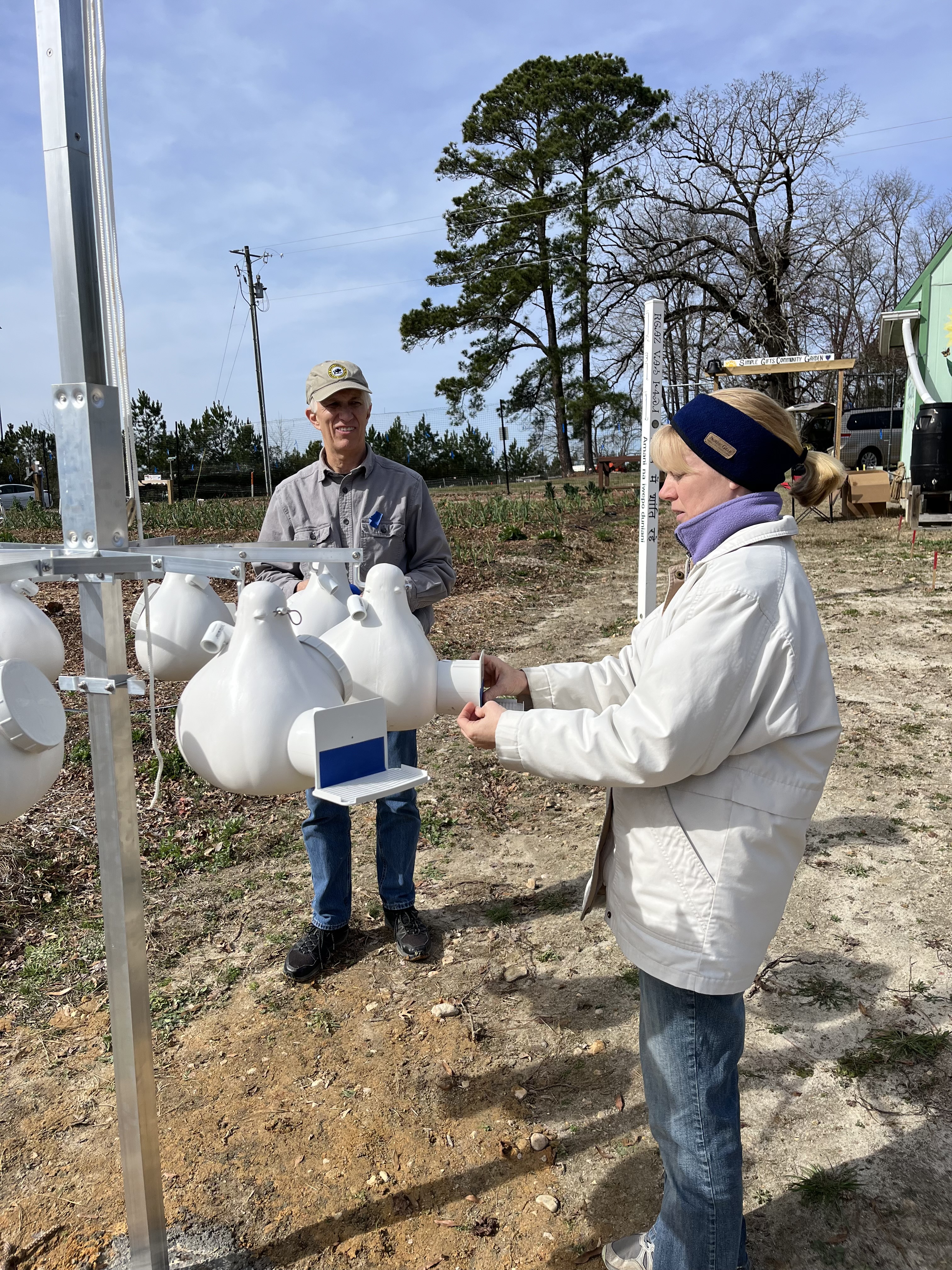 Courtney (NC Purple Martin Society), Luke (NC Wildlife Federation), and Monty (South Wake Conservationists) worked together to assemble the housing structure, prepare the inside of the gourds for nesting, and hoist it into place at 14 feet tall. It fit perfectly into the ground sleeve, cemented into place by Carl at the garden on Monday, which allows the assembly to be easily removed and safely stored in the shed loft during the off-season. Once the bluebirds have adopted the bluebird houses installed nearby a few months ago, we will pull the tape off the entrance holes and invite the purple martins in. One bluebird house already has a new nest in it, so just waiting for the first egg to confirm the lease and invite the purple martins to come!
