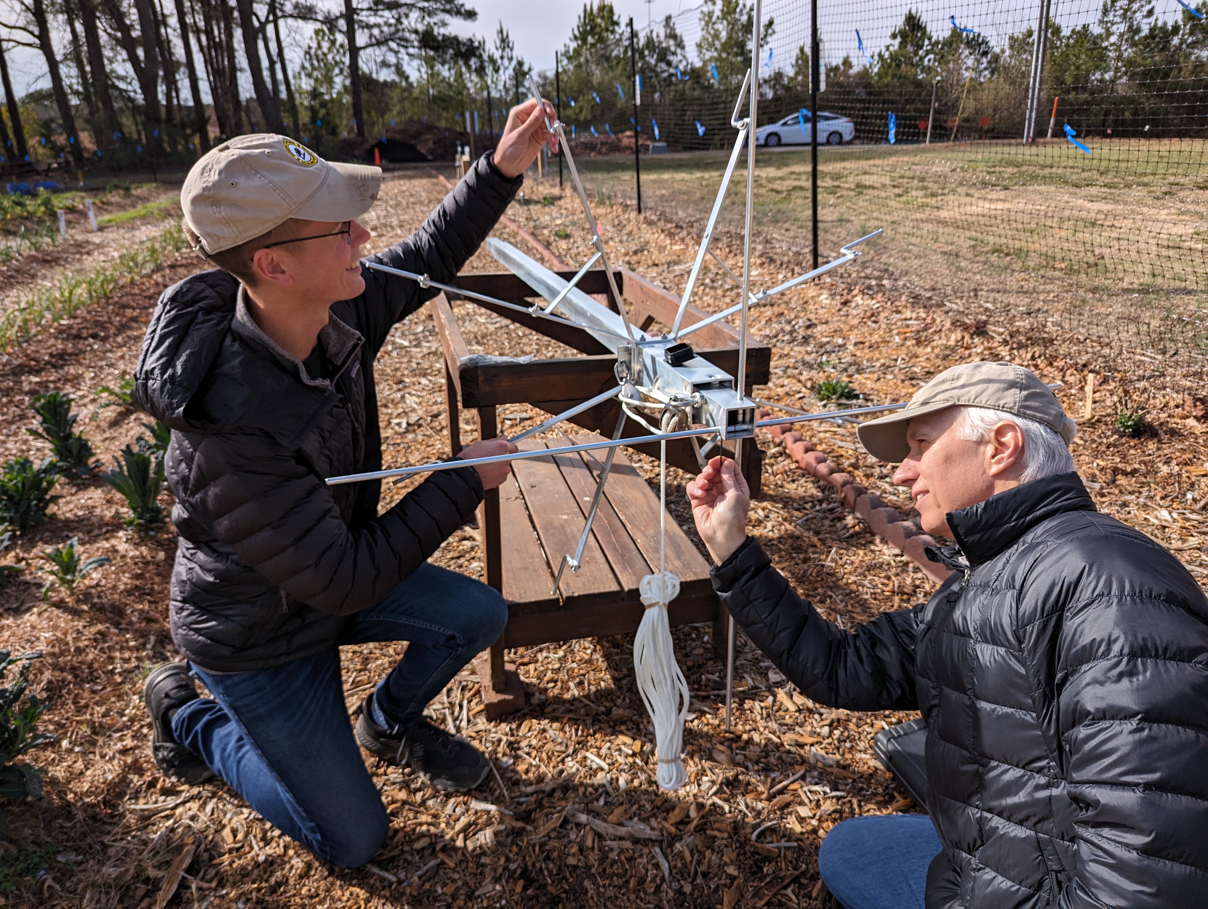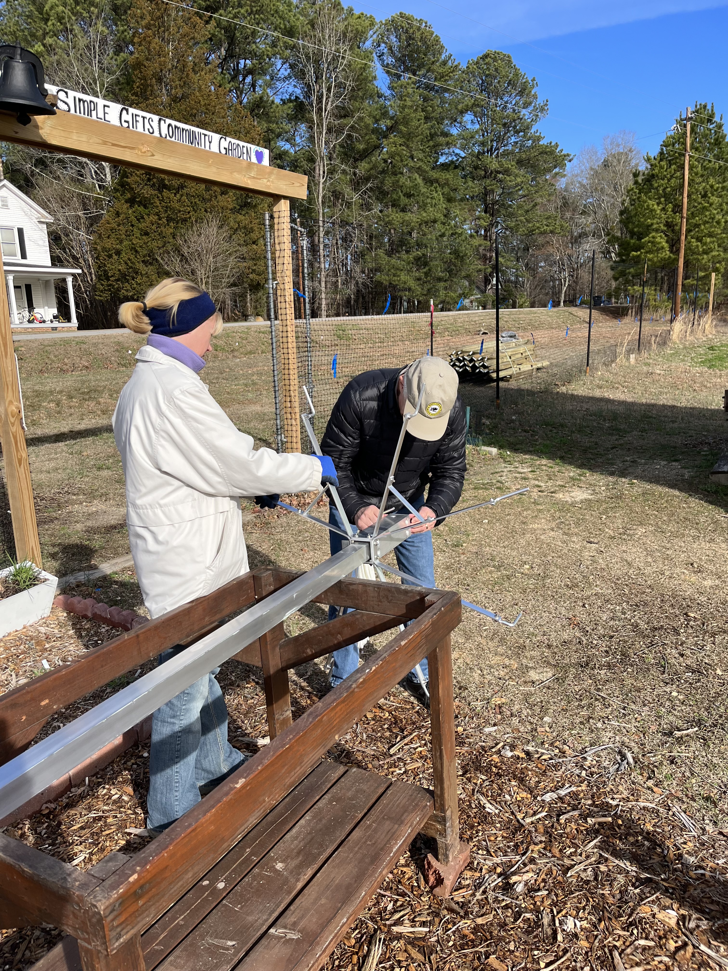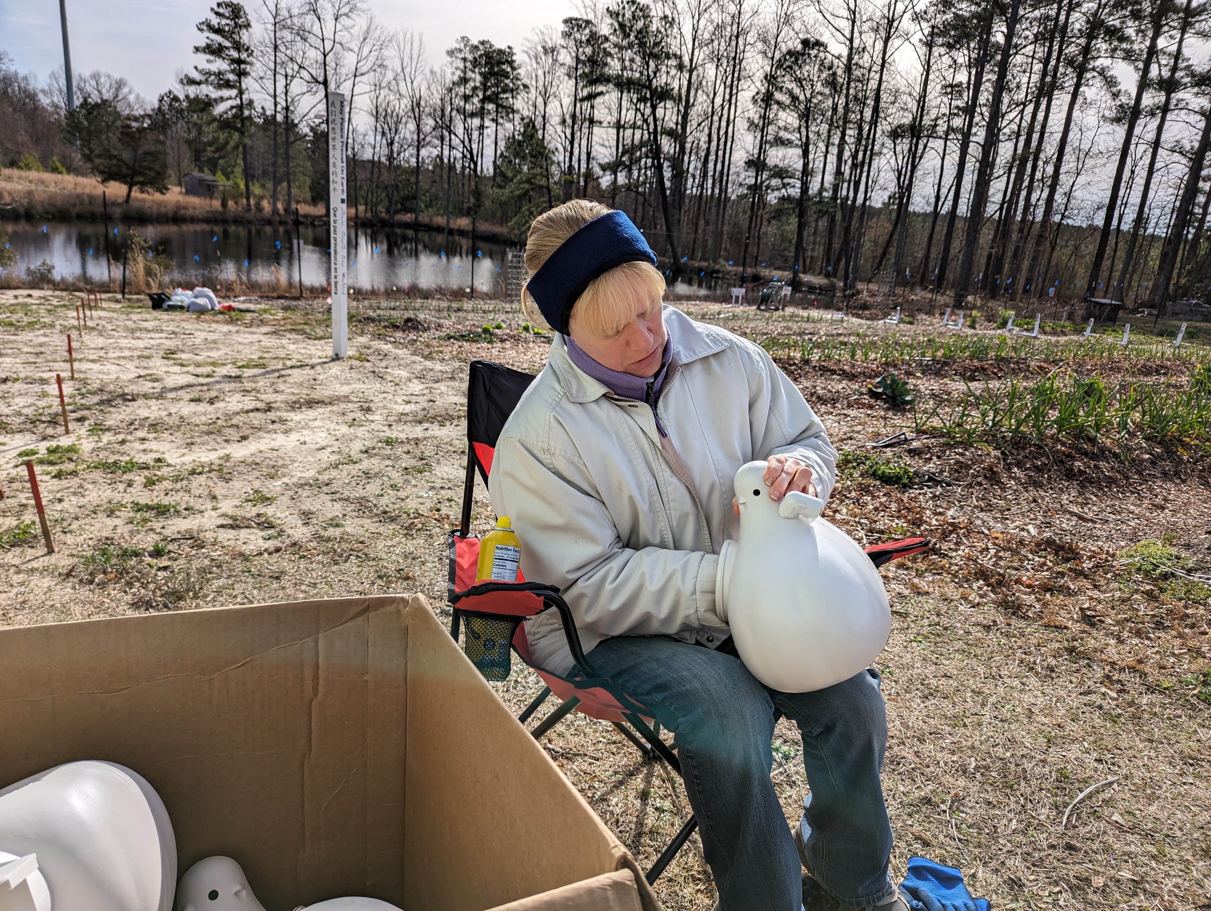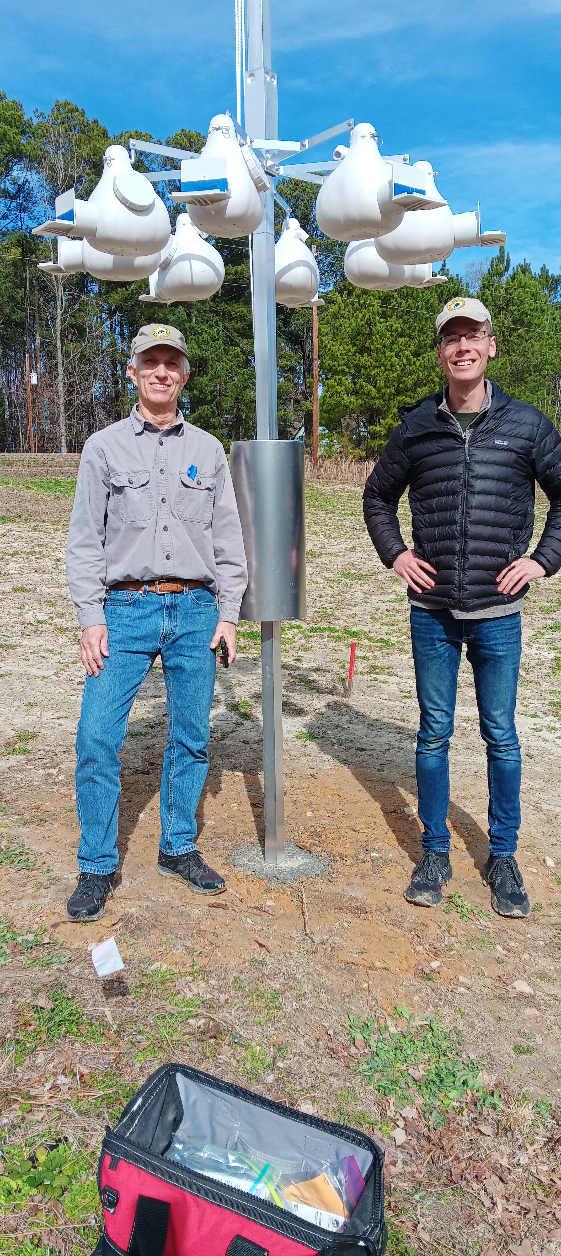 Courtney (NC Purple Martin Society), Luke (NC Wildlife Federation), and Monty (South Wake Conservationists) worked together to assemble the housing structure, prepare the inside of the gourds for nesting, and hoist it into place at 14 feet tall. It fit perfectly into the ground sleeve, cemented into place by Carl at the garden on Monday, which allows the assembly to be easily removed and safely stored in the shed loft during the off-season. Once the bluebirds have adopted the bluebird houses installed nearby a few months ago, we will pull the tape off the entrance holes and invite the purple martins in. One bluebird house already has a new nest in it, so just waiting for the first egg to confirm the lease and invite the purple martins to come!