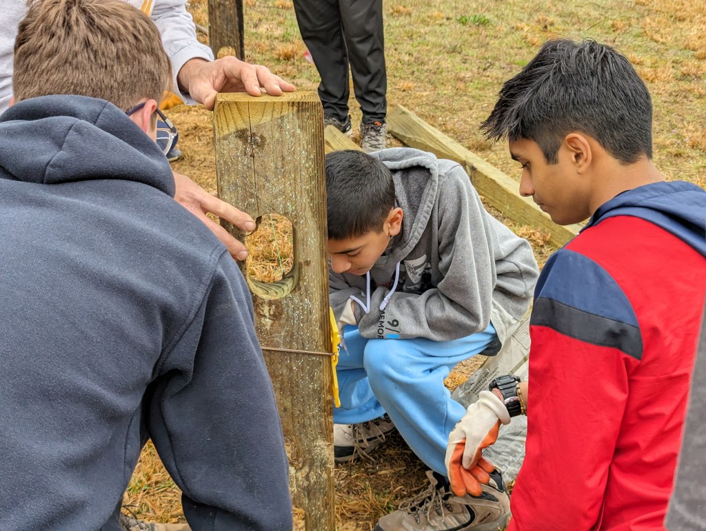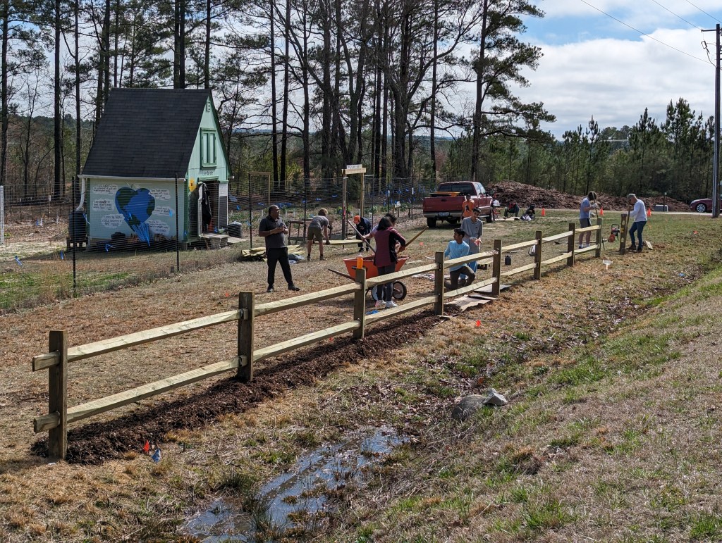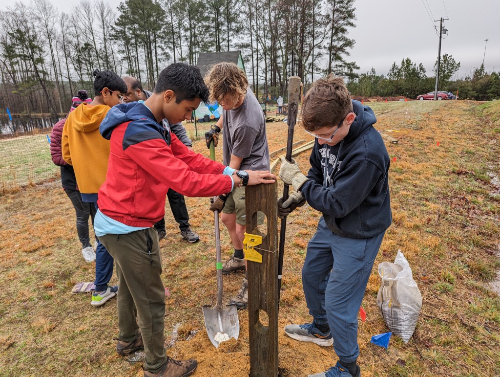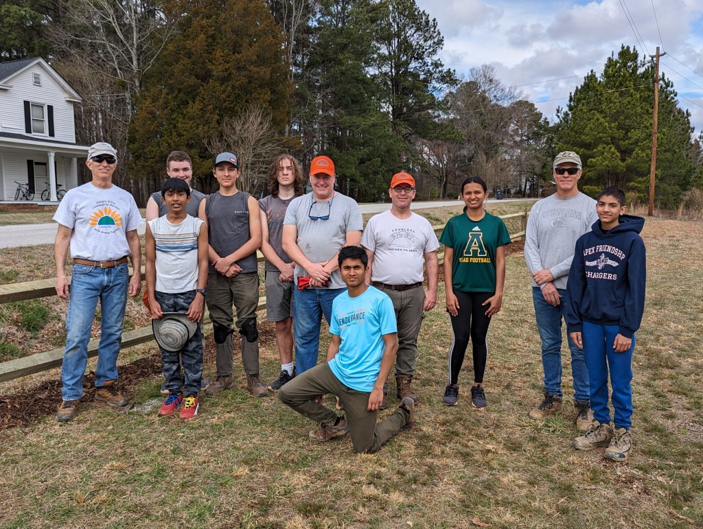 Thanks to Eagle-Scout candidate Yagya Kasera of BSA Troop 320 in Fuquay Varina, Simple Gifts Community Garden now has a beautiful, new split-rail fence along the road frontage. This not only enhances the overall appearance of the garden, as you approach it, but it provides a great safety barrier to prevent people accidentally backing their cars into the ditch! Per BSA guidelines, the funds are raised by the scout, and the project is fully planned and executed by the scout, directing others in the actual work. The project resulted in a 180 foot fence, executed over three shifts during the weekend of March 2. The only part adults needed to do was to drill the 18 post holes, because scouts are not permitted to operate power equipment. Carl and Monty heard it was 18 holes, but soon learned this is not golf!