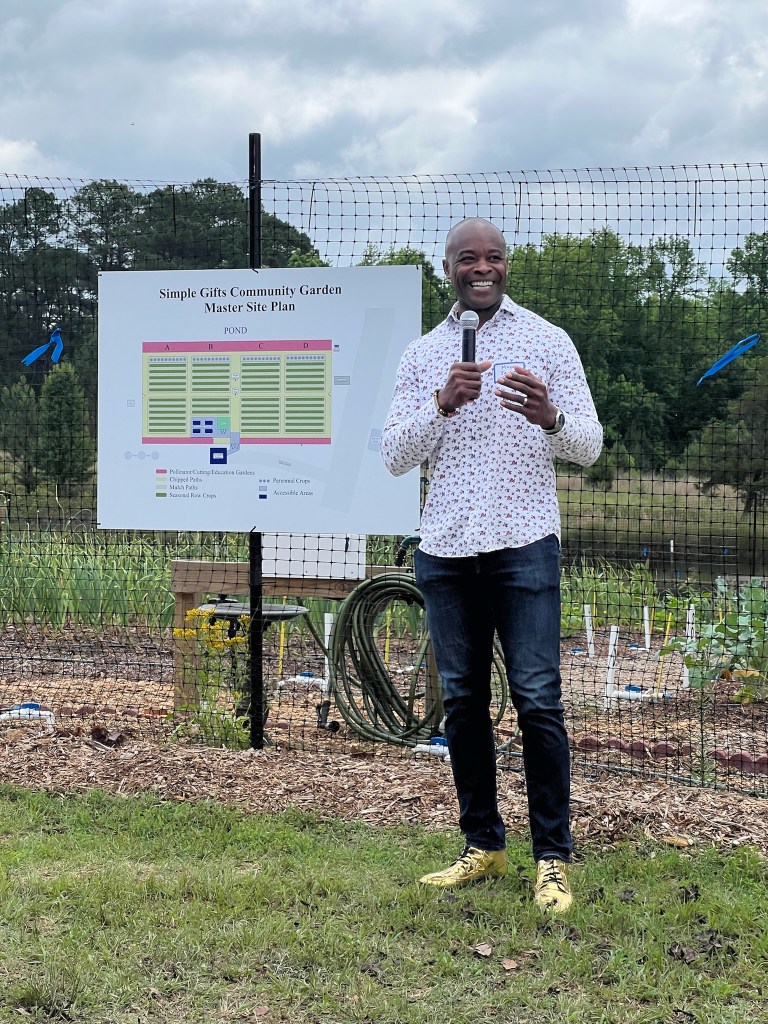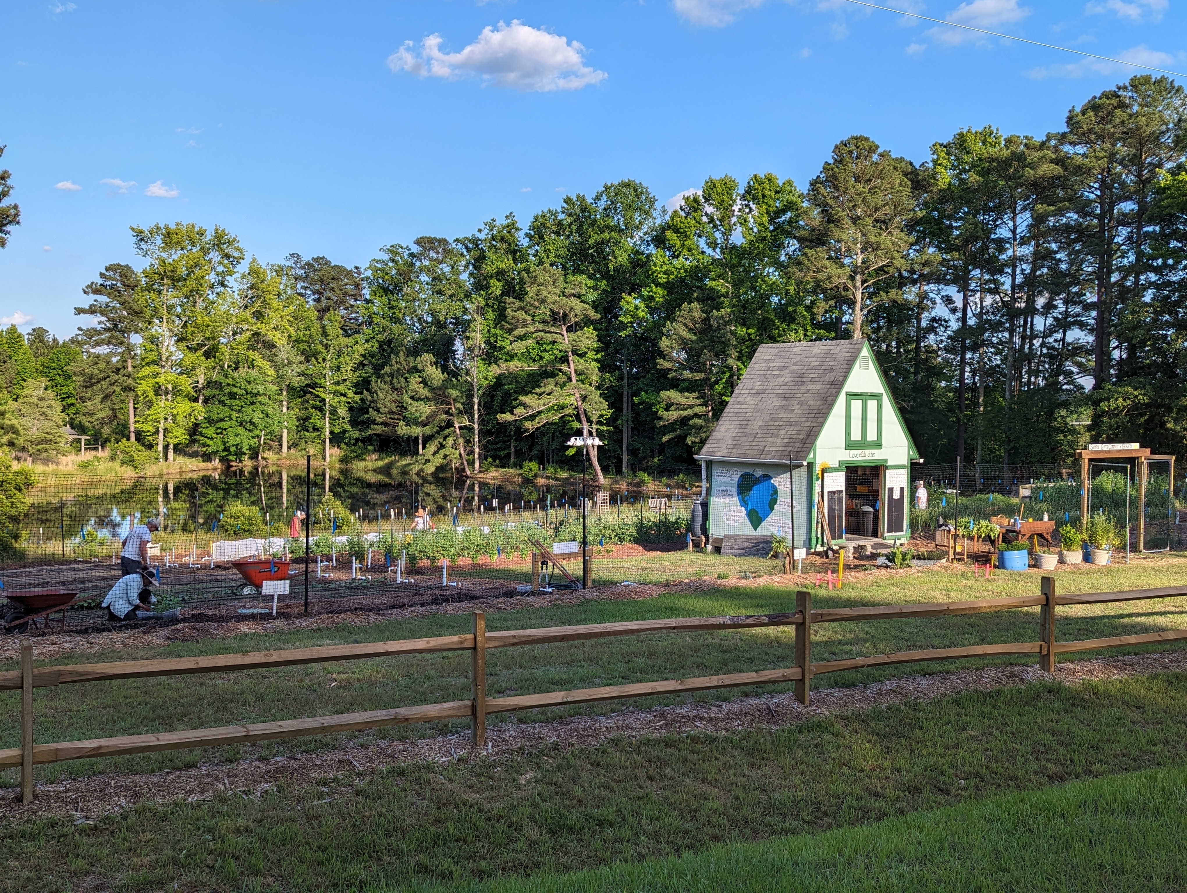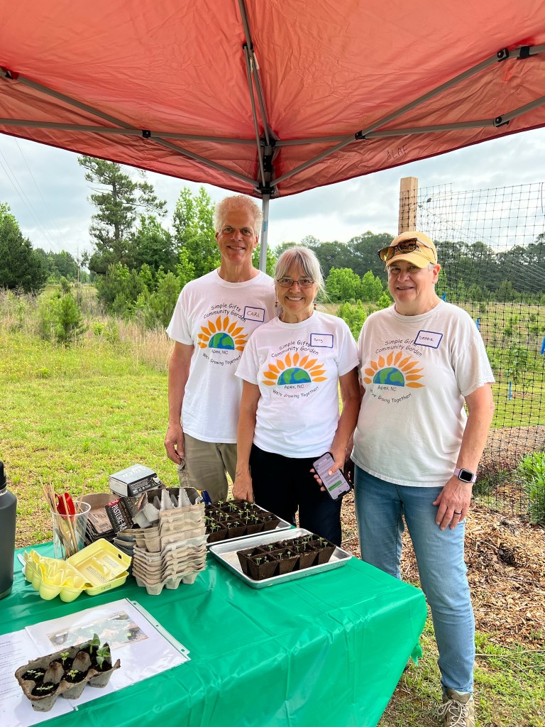 It was a wonderful (thankfully rain-free!) morning in Apex on May 18th, celebrating the grand opening of our new location for the Simple Gifts Community Garden. In just fifteen months, this property went from an open, shrubby field to a fully-operational 1/2 acre garden with fencing, irrigation, electricity, 45 rows of crops, and the original, iconic garden shed. Mayor Jacques Gilbert cut the ceremonial ribbon with Pastor Laura Katherine Stern from the sponsoring Apex UMC, and Angie Field represented the YMCA of the Triangle, which generously provides the land the garden shares. Also there to celebrate were representatives from the three food banks we support, including Shirley Fieldings and Helen Davenport from St. Mary’s AME church and Pat Haggard from the Holly Springs Food Cupboard. The Point Church Care Pantry was not able to join, as they were doing their regular food distribution Saturday morning. Approximately 75-100 people celebrated this great milestone together.