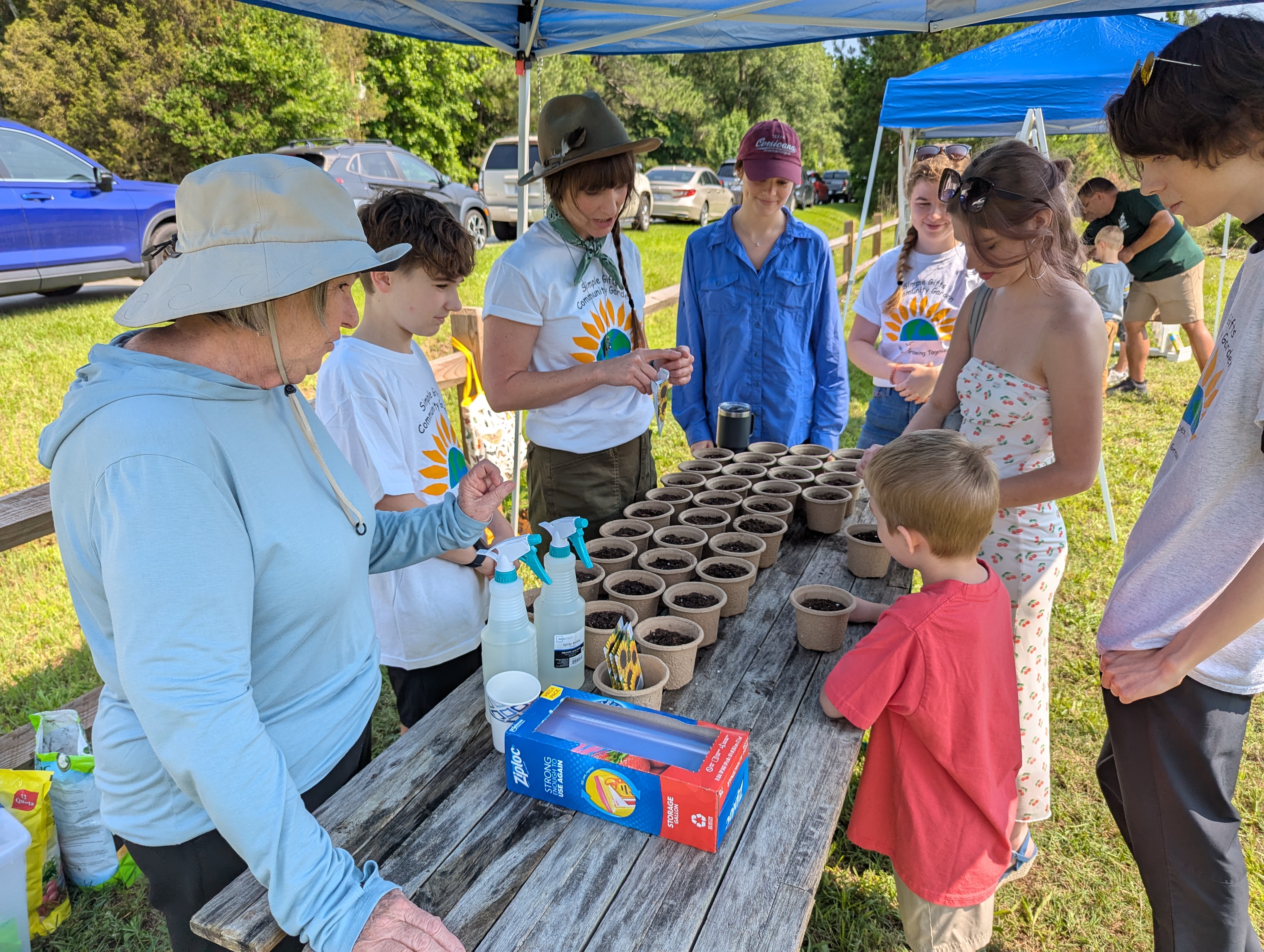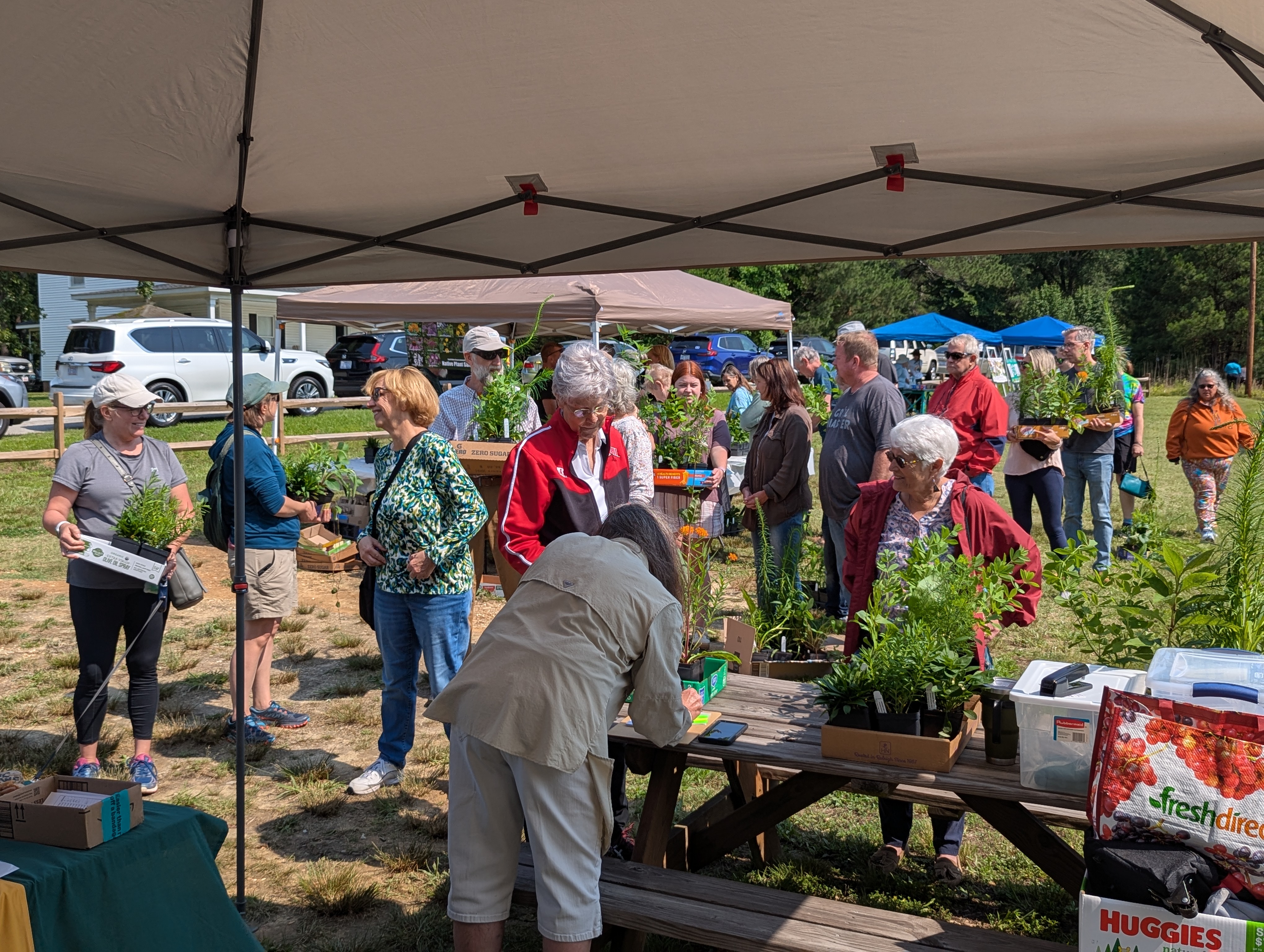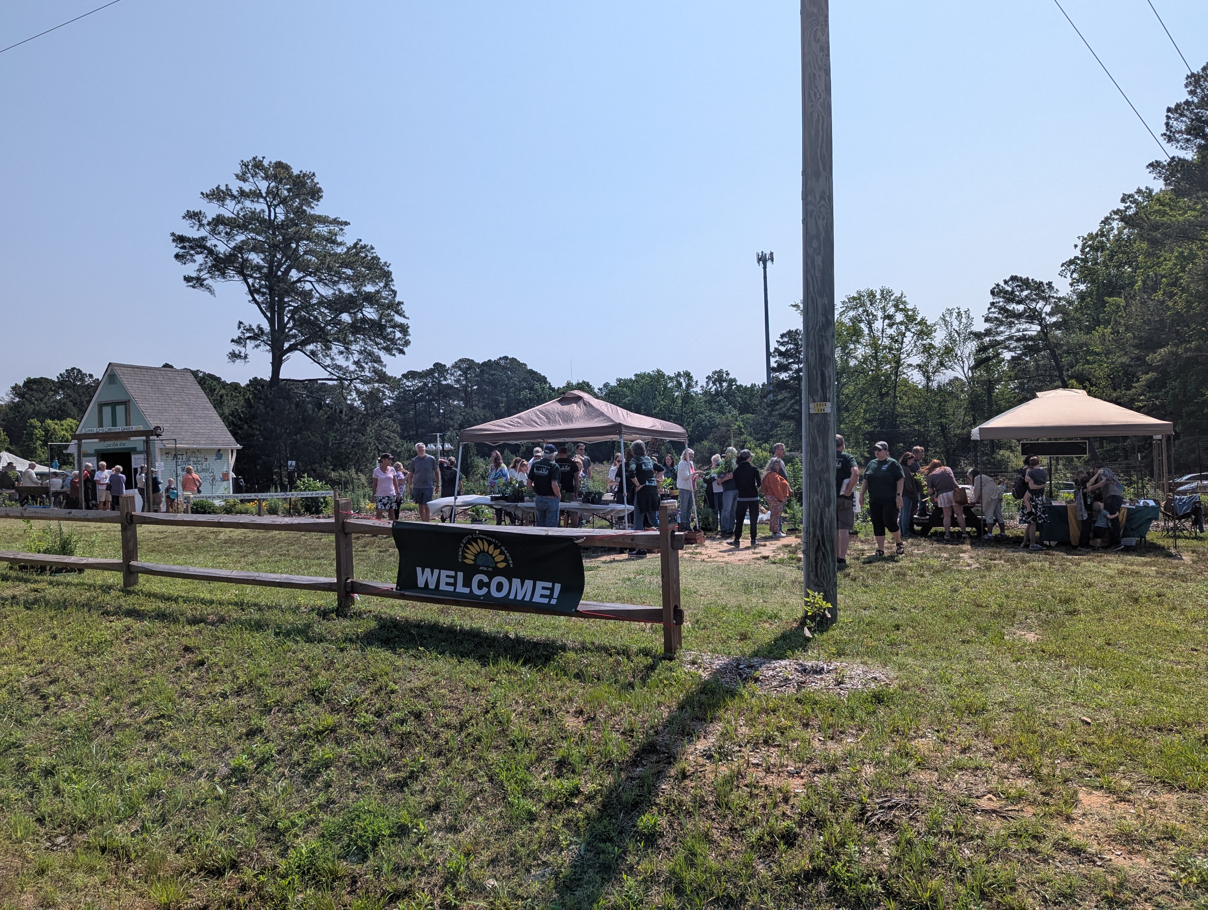 Simple Gifts Community Garden joined forces again with South Wake Conservationists to hold an Open House together with the the SWC Native Plant Sale at the garden Saturday morning. This was our first open house since the grand opening last year and something we hope will become an annual tradition. The community came out in force, with an estimated 150-200 people attending this joint event. Garden leaders took turns leading small groups on tours of the garden, ending at the refreshments and membership tables by the shed. The reaction of visitors to what they saw and learned at the garden was consistently enthusiastic. In just a couple of hours, we added eight new families to our membership rolls!