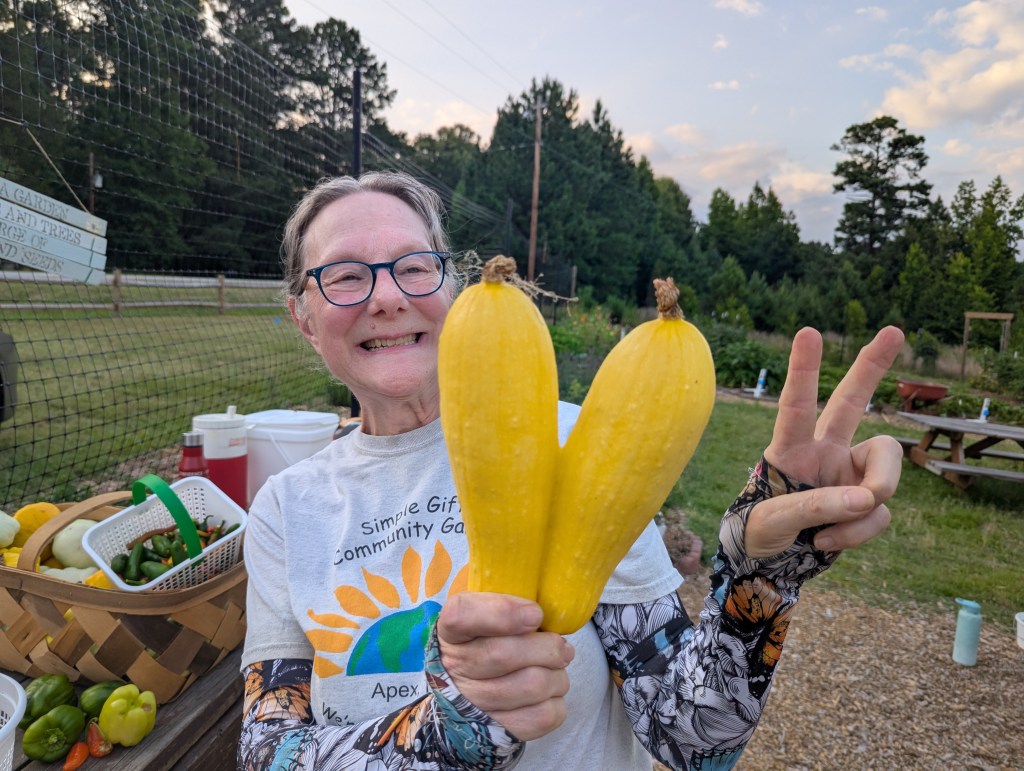 The veggies are talking to us now! Come on out and join us, as we reap the fruit of our collective labors. The crops are doing very well, and our focus is on harvesting now. We took 77 pounds of fresh vegetables to the Holly Springs Food Cupboard last night and are on track for a very productive year. We start at 8 AM on Thursdays now, as well as Saturdays, while it is still cool. Tuesday evenings start at 6 PM, after the heat subsides as well. The weather looks good for tomorrow morning (70’s), as well as Saturday morning (73-80), so join us when you can. Bring a friend!