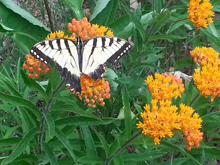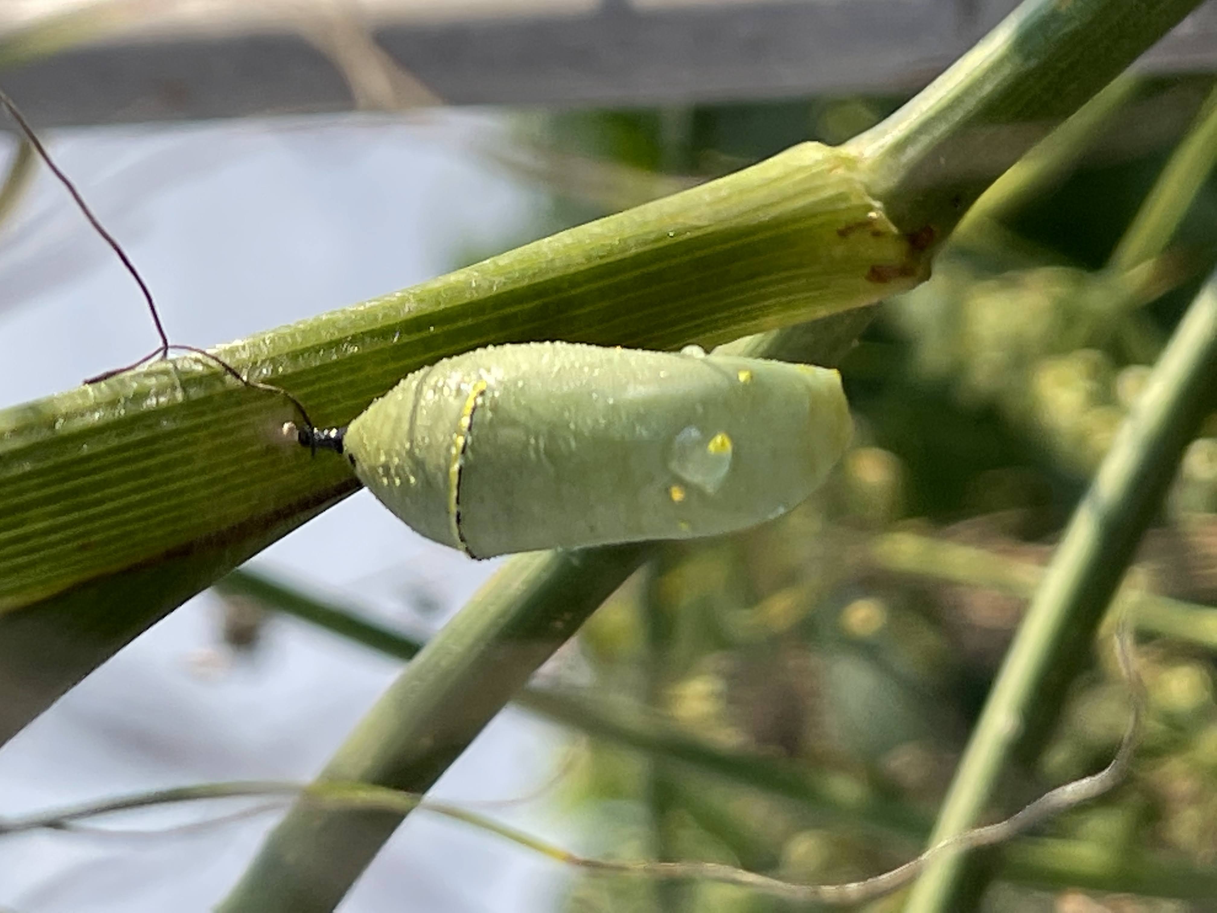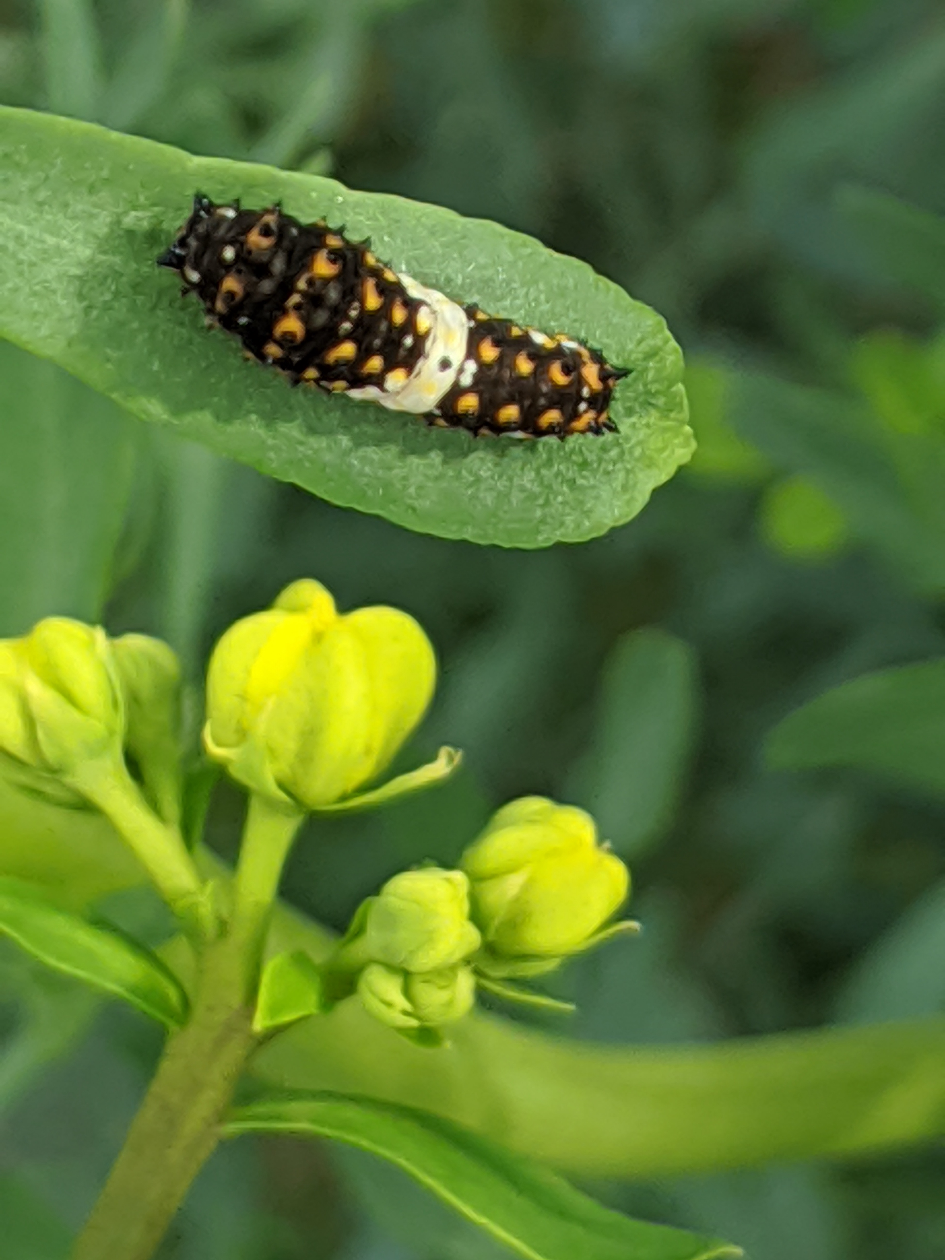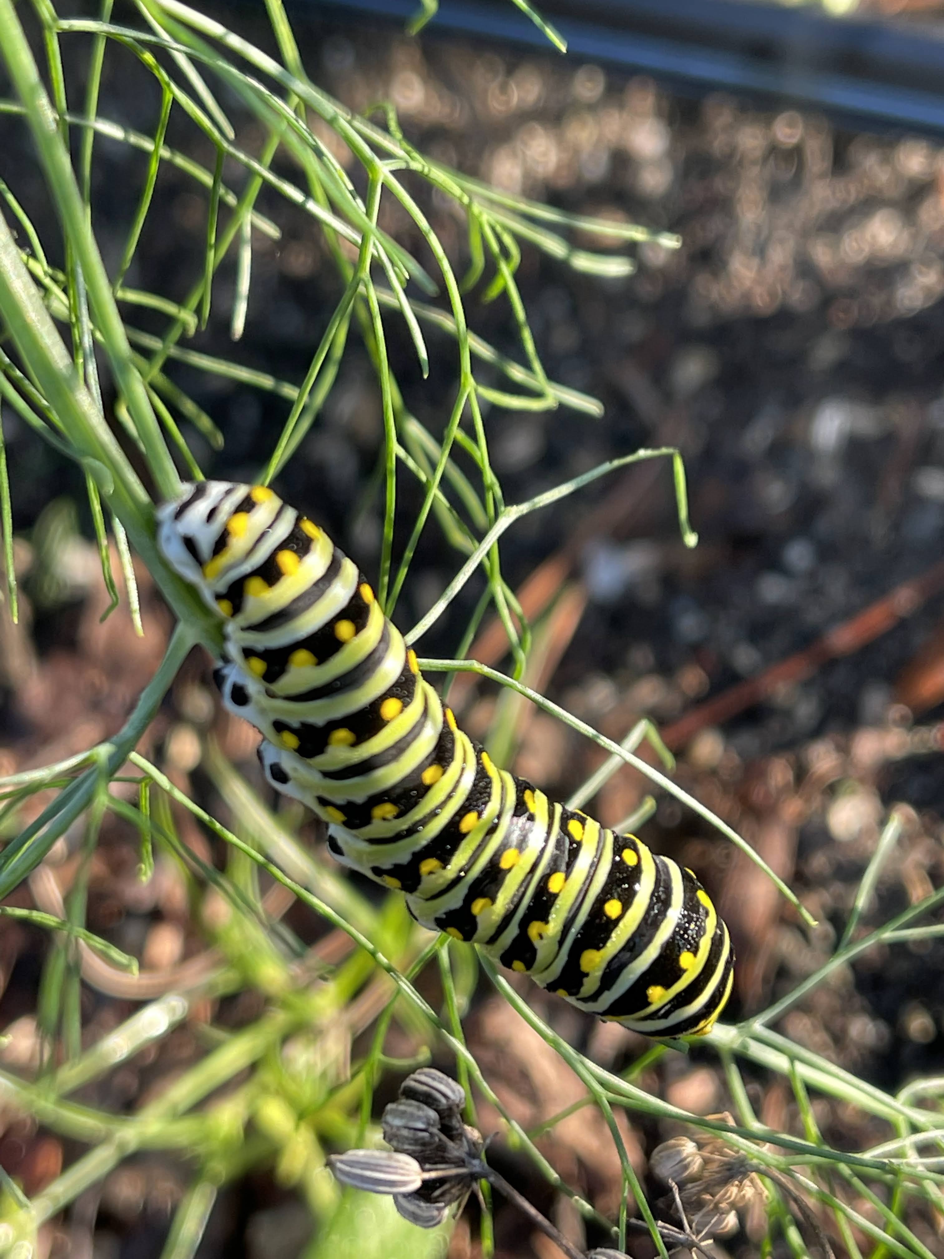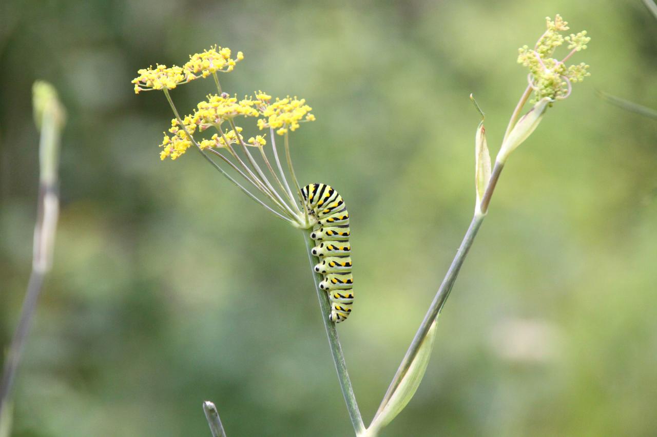 Throughout our pollinator and herb gardens, we have planted milkweed, fennel, parsley, and rue that support caterpillars of swallowtail and monarch butterflies.